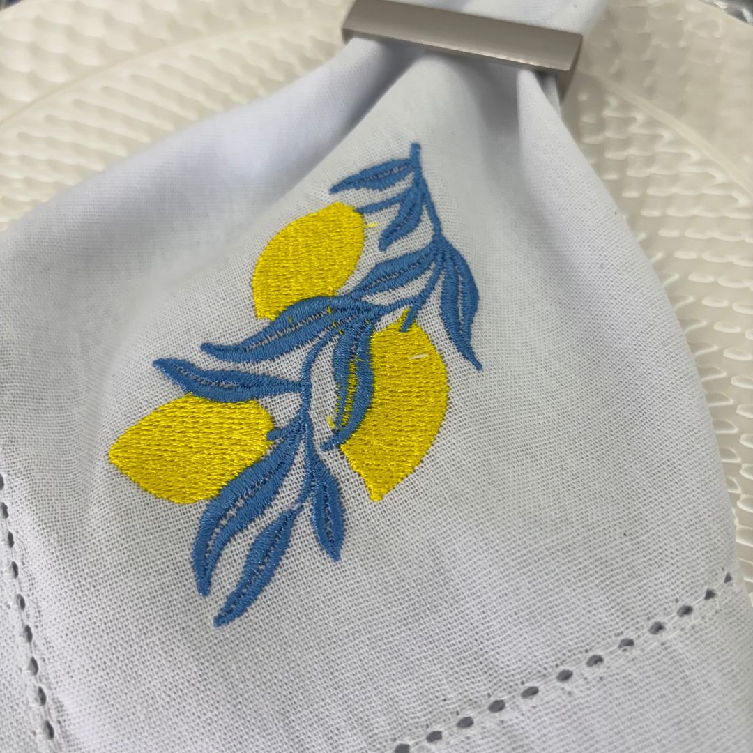 Guardanapo linho misto bordado – branco – limão siciliano folhas azuis