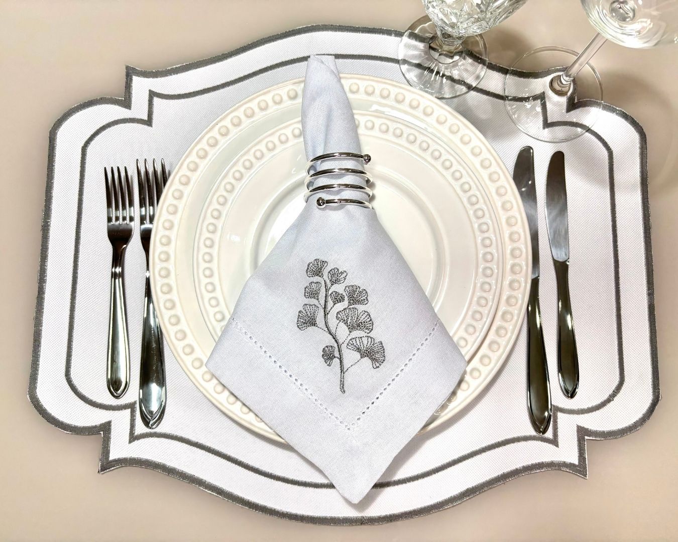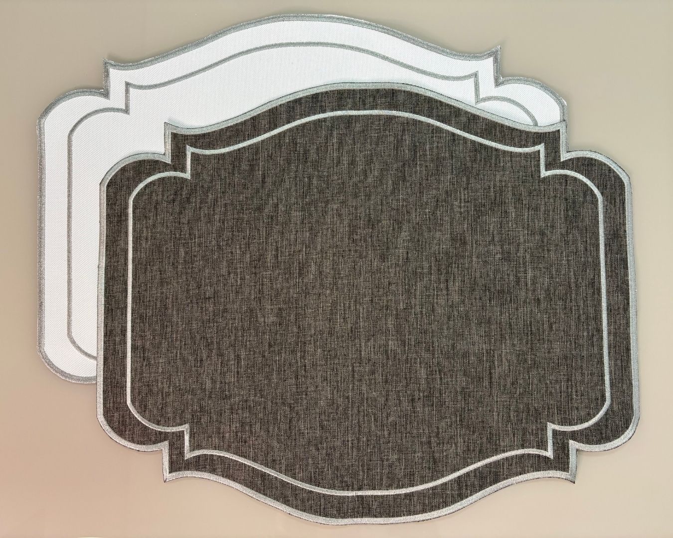 Lugar Americano Classic Linho – 2 faces – cinza / branco com bordado branco
